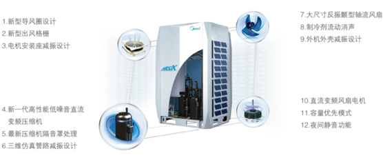 利用CFD、FEM等先進(jìn)技術(shù)對(duì)空調(diào)系統(tǒng)的元器件振動(dòng)源進(jìn)行優(yōu)化,實(shí)現(xiàn)靜音運(yùn)轉(zhuǎn),夜間運(yùn)行模式把噪音降低到最低。